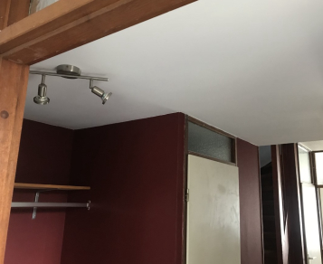 Het plafond in het dakkapel van de masterbedroom van gipsplaten voorzien, zodat het plafond glad gestuct kon worden. Daarna de muren geschilderd en een muur behangen.